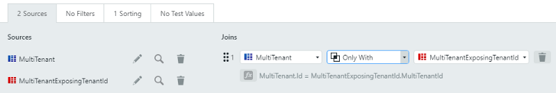 Additionally, when joining an entity that exposes the Tenant Identifier (property Show Tenant Identifier) and a normal Multi-tenant entity in an aggregate with the option Configure Tenant set to Test Queries, we don’t need to filter by TenantId. It is done automatically since you have a normal Multi-tenant entity in the query.
